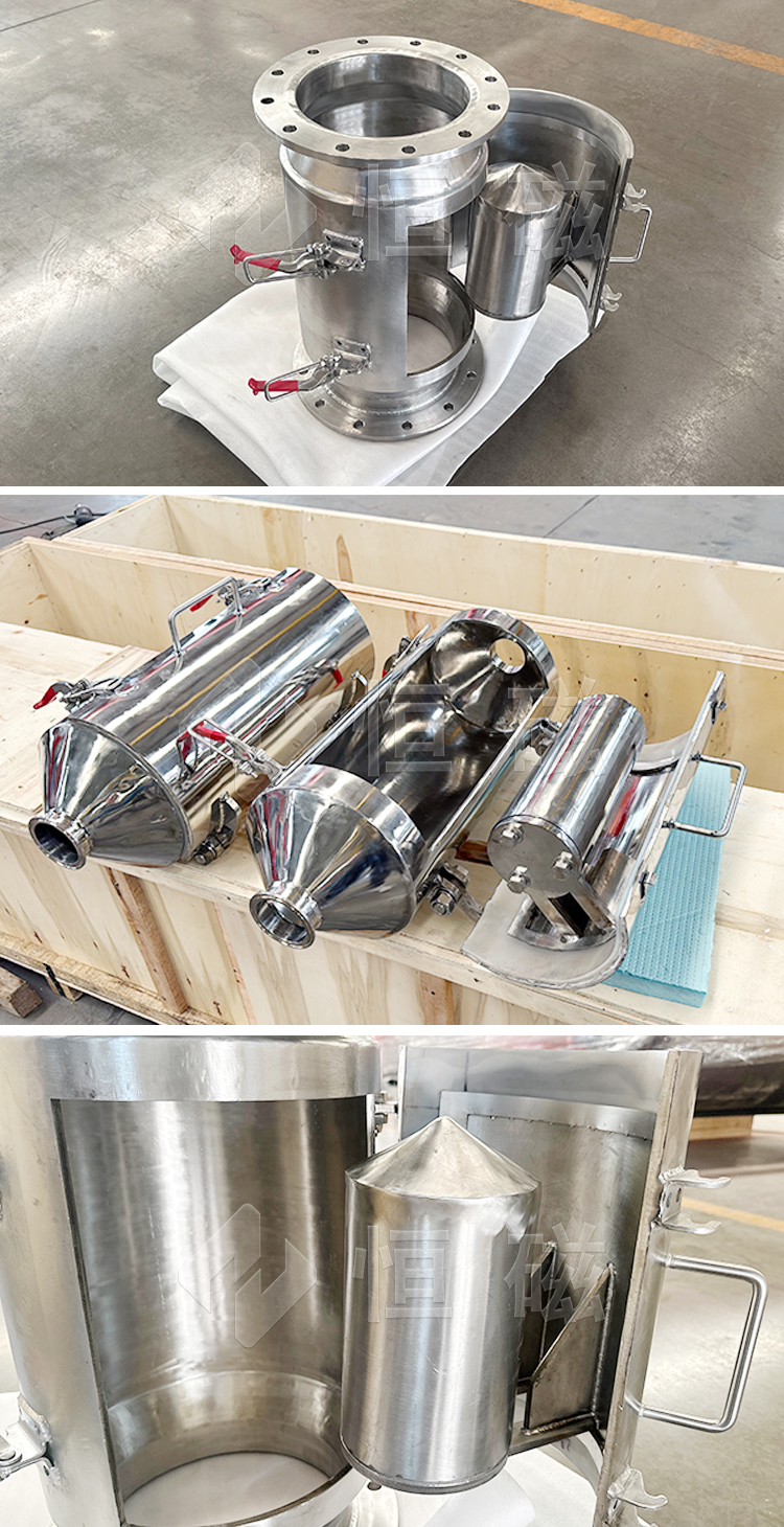 RCYZ型垂直管道式永磁除铁器是一种以永磁材料产生强大磁场吸引力的节能型设备,内部采用钕铁硼材料组成的环状磁系,圆锥形体,结构合理,磁场强度高。可与固态原料输送设备连接,活动式门扣,清除铁质方便,适用于食品、面粉、陶瓷、化工、水泥、建材、石英砂等行业各类固态小颗粒和粉末状物料中除铁。