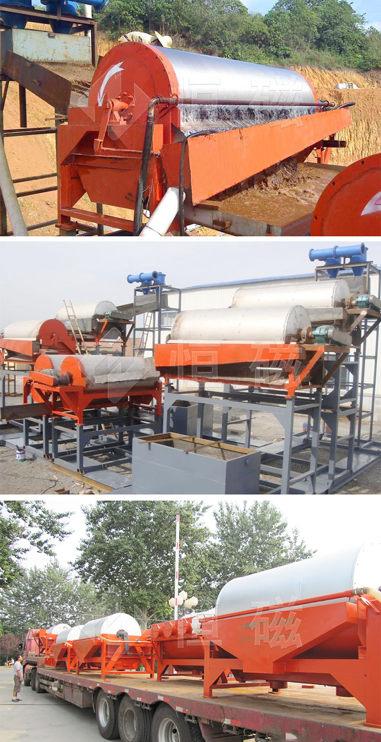其原理是当矿浆进入磁场区时,其中强磁性矿物被吸附在圆筒表面,弱磁性和非磁性矿物被水流冲洗排出,而吸附在圆筒表面上的磁性矿物随圆筒旋转,被带出磁场区,用冲洗水冲入精矿槽中,完成分选作业。